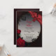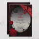 O convite de casamento de temas góticos feito em gráficos de uma área de texto oval, contra um fundo de burgundy escuro angustiado. A trabalho de arte gráfica de um arco de cetim vermelho, rosas vermelhas e preto floresce à volta da área de texto. Personalize todos os campos de texto para seu dia especial. Os produtos de casamento correspondentes estão disponíveis.