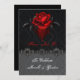 O convite só de recepção tem uma estética gótica e romântica impressionante. Uma rosa vermelha proeminente toma o palco central no topo, mergulhando um líquido vermelho vívido num pano de fundo em forma de coração. O fundo negro é enfeitado com uma intrincada cor damasco que melhora a sensação dramática. Abaixo do rosa, há uma decoração prateada semelhante a rendas que adiciona elegância e divide o cartão em duas seções. A metade inferior apresenta um fundo com padrão de umidade de cinza com sofisticados elementos de design em vermelho e branco. Exude encanto e mistério enquanto mantém um ar de refinamento.