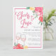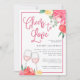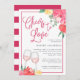 Chá de panela elegante e moderno para amantes de vinho apresenta flores alveolares, coloridas, e duas taças de vinho rosé. "Cheers to Love" aparece em letras brilhantes de escrita manuscrita rosa. Personalize com os detalhes do seu chá de panela, uma elegante letra de cinza azul. Cartões invertidos para listras cor-de-rosa e brancas fuchsia.