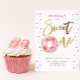 O primeiro convite de aniversário de uma garota bonita e colorida com ilustração aquosa de uma rosquinha rosa com borrifações coloridas. O texto falsa do ouro diz "doce".