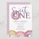 Um primeiro aniversario para marcar o primeiro aniversário de um marco da sua menina. O convite é um tema de sobremesa com uma rosquinha/rosca de cor-de-água delgada. A mensagem diz "Doce" em conformidade com o convite para o tema da sobremesa. Este convite pode ser personalizado com a inclusão dos detalhes do seu pequeno partido. A design é bonita, moderna e doce.
