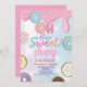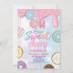 Bonito convite de aniversário em estilo. Tema: Rosquinha. Ocasião: Festa de aniversário. Estilo: Bonito, Cheio, Divertido, Elegante. Cores: Rosa, Roxo, Turquesa, Branco. Gráficos: Rosquinha, aspersão arco-íris, gotejamento.
