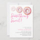 Celebre sua menina com este convite para chás de fraldas moderno, tema da rosquinha. Ele apresenta a frase divertida "Fazendo algo doce!" no topo, com rosquinhas cor-de-rosa foscos e borrifadas coloridas. O fundo branco limpo e o design lúdico tornam-no perfeito para uma celebração doce e na moda. Fácil de personalizar e disponível como cartão impresso ou download digital.