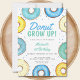Está planejando a primeira festa de aniversário de um menino? Este belo convite de aniversário é decorado com rosquinhas de aquarela em tons de azul e amarelo e diz "Rosquinha cresce" na tipografia de na moda. Tem um padrão de rosca no verso. Facilmente personalizável. Original Watercolor © Michele Davies.