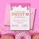 Um fundo branco apresenta a palavra "SWEET" em letras grandes, estilizadas, maiúsculas. As letras são formadas por um bege claro ou rosquinha amarelo-ouro, com uma camada de gelo cor-de-rosa pingando sobre as letras e uma abundância de aspersão multicolorida. O gelo cor-de-rosa cai da borda superior da imagem, também estudada com bordas. Uma porção de uma rosquinha cor-de-rosa, revestida de um orifício em forma de coração, é colocada à direita e ligeiramente abaixo da palavra. A textura de fundo parece ser um branco suave e suave. Disponível como convites imprimíveis e downloads instantâneos.