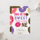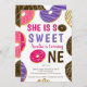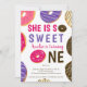 Ela é tão doce, fazendo uma. Celebração do primeiro aniversario .Uma mão bonita e moderna desenhada e com uma coloração aquosa pintada de rosquinhas de chocolate, vidros e borrifagens cor-de-rosa e uma legal tipografia de fontes num fundo totalmente personalizável.