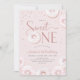 Rosquinhas cor-de-rosa-claro, um convite de festas de primeiro aniversario. Design de tendências cegas com rosquinhas cor-de-água rosa e branca. Apresenta a fonte do script de tipografia 1. Você pode escolher convites impressos e/ou fazer o download instantâneo do modelo digital. Perfeito para uma festa de 1ª mulher na moda.
