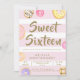Uma garota nunca é velha demais para rosquinhas! Envie este doce convite de aniversário 16, divertido, com faixas de cor rosa com borrão em negrito, sobrepostas com rosquinhas de cor d'água e texto de ouro falso. O inverso também apresenta as faixas de pincel cor-de-rosa pinceladas.