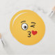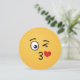 Um emoji beijador. Um olho está aberto, o outro está piscando. Um coração é mostrado deixando a boca beijando.