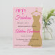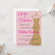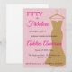 Convite de aniversário de 50 anos moderno, minimalista, rosa, dourado e preto, que você pode personalizar e enviar para a celebração do seu aniversário de cinquenta anos. As palavras "Cinquenta e Fabuloso" estão definidas em um fundo rosa, com tipografia de letra cursiva rosa quente popular, colocada ao lado de um elegante e sofisticado vestido de noite dourado sem alças.