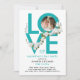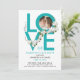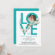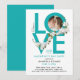 Este convite moderno para uma festa do Dia dos Namorados tem um grande e ousado script turquesa dizendo Amor, uma foto de um casal dentro de uma das letras e alguns ornamentos florais brancos. O verso é turquesa. Também pode ser personalizado para ser usado para um aniversário de casamento, para um aniversário, para a Páscoa ou outra ocasião festiva.