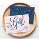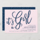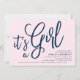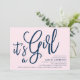 Celebrar a futura mãe ou os pais a serem com este convite para o Chá de fraldas na moda com as palavras "É uma Rapariga" em um roteiro de pincel azul moderno contra a rosa claro. A placa tem um padrão vermelhos e brancos esfolados no lado traseiro. Personalize-o substituindo o texto do marcador de posição. Para obter mais opções, como alterar a fonte e seu tamanho/cor ou o espaçamento entre letras, clique no botão "Personalizar". *Observe que a Marca d'água do Zazzle que aparece na visualização de zoom NÃO aparecerá no produto impresso final. © Rosewood e Citrus
