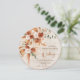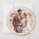 The circular design features a beautiful wood-cut photo frame on the back—ideal for showcasing your favorite engagement picture of the couple surrounded by golden fields. Elegant script typography announces your special day in warm neutral tones that feel both modern and organic.