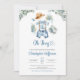Design de tendências para Chá de fraldas de menino apresenta roupas de bebê em roupas de camuflagem decorada em verde eucalipto misturado com flores poeirentas azuis e verde pastel. A letra do desenho de mão divertida diz "Oh, garoto!". Não hesite em contactar-me para obter itens ou personalizações correspondentes. Rosas de cor Bebê ©