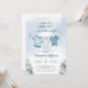 O popular design de Chá de fraldas de menino mostra roupas de bebê em roupas de roupas de roupas decoradas em boho azul empoeirado e flores verdes. Letras de desenho de mão divertidas dizem: "Um doce menino está a caminho". Não hesite em contactar-me para obter itens ou personalizações correspondentes. Rosas de cor Bebê ©