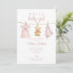 Este convite de chá de bebê fofo apresenta uma linda linha de roupas de bebê de menina cor-de-rosa e pode ser personalizado com seus detalhes em tipografia elegante. O verso apresenta os detalhes do seu evento e código QR do registro. Criado por Thisisnotme©