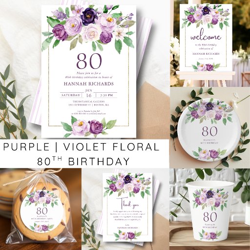 Convites Roxo Elegante | Violet Floral 80 Birthday