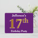 Este design de convite apresenta o número ordinal "17º" com uma aparência falsa em forma de ouro. Ele também apresenta um nome personalizado e um fundo de cor roxa. Os detalhes do evento no verso podem ser personalizados. Poderia ser usado para convidar pessoas para a décima sétima festa de aniversário de alguém. [~Z0000014]