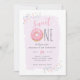 Roxo | Bolsas cor-de-rosa aspergaminhadas, espirais, primeiros aniversarios doces. O primeiro aniversário é definitivamente muito especial, então comemore o primeiro aniversario de sua garotinha com nossos convites únicos e divertidos! Apresentando uma rosquinha cor-de-rosa com borrifo colorido mostrando "UM doce" no topo. Os detalhes do seu partido são mostrados em tipografia fofa e de tendência contra uma camada de água púrpura pastel. Inverter para um fundo rosa brilhante com aspersores.