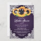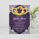 Complemente seu casamento roxo rústico com esses convites de chá de panela florais roxos elegantes com girassóis em um fundo roxo enfeitiçado com luzes de cordas e rendas florais brancas. Itens correspondentes disponíveis.