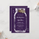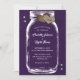 Um convite de casamento roxo e costume com um jarro de mason e dois corações em um fundo de burlap. Personalize facilmente este convite de casamento do Mason jar com seus detalhes de casamento.
