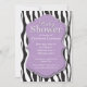 Estes convites adoráveis do chá de fraldas caracterizam um fundo preto & branco do impressão da zebra. Na parte superior é uma forma roxa decorativa com uma beira branca. As palavras "chá de fraldas" são indicadas sobre os convites em uma pia batismal denominada. Personalize o convite com seus detalhes para o chá de fraldas na moda perfeito!
