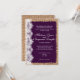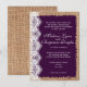 Estes convites rústicos do casamento do país caracterizam uma serapilheira e um design impresso laço com um profundo - fundo roxo. Estes são grandes para todo o país ou casamento denominado rústico. Apenas adicione seu próprio convite do casamento que exprime a este modelo. Estes são grandes para qualquer um com as cores roxas do casamento que procuram um estilo do convite do casamento vintage.