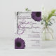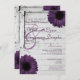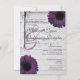 Profundamente - os convites roxos do casamento da margarida de Gerber da ameixa em um branco lavaram a porta de madeira do celeiro e a rotulação roxa. Estes são grandes para casamentos rústicos do país.
