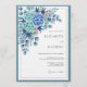 This design features a lush arrangement of hydrangea blooms in varying shades of blue, accented by delicate eucalyptus leaves and subtle pink floral details. It evokes a feeling of elegant, natural beauty perfect for a romantic occasion. The dominant blue palette offers a serene yet sophisticated aesthetic.
