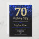 convite de aniversário 70. Elegante design azul real com ouro brilhante. Apresenta na moda diamante, luzes e fontes de script. Homens ou mulheres convidam no dia. Perfeito para uma festa de aniversário adulta na moda. Personalize com seus próprios detalhes. Envie-me uma mensagem se precisar de mais personalização. Impressos convites Zazzle ou modelo de impressão digital instantânea para download.