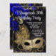 Convite de festas azul real e mascarada de ouro com uma bela máscara de joia dourada e penas num fundo floral azul e dourado. Você pode personalizar o número conforme necessário para seu evento - este é um convite de aniversário de qualquer número. Este convite de festas mascarada azul real é facilmente personalizado para o seu evento simplesmente adicionando os detalhes do seu evento.