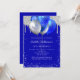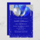 A royal blue background. Decorated with faux silver glitter drips paint dripping look, sparkles and balloons. Personalize and add a name and party details. The name is written with a hand lettered style script.