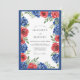 This design features a striking contrast of bold crimson roses and deep sapphire blue hydrangeas. Soft watercolor brushstrokes create a rich floral arrangement against a clean white backdrop. Lush green foliage adds a natural touch to the vibrant primary color palette. The aesthetic is both classic and spirited, perfect for a high-summer event.