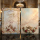 Transport your guests to a realm of classical romance with this opulent design, featuring celestial motifs and ornate detailing for a truly grand occasion.This design features a digitally painted oil illustration of a cherub playing a violin, set against a celestial background of soft blue clouds and sun rays. The central art is surrounded by a complex border simulating the look of carved stone and gilded acanthus scrollwork. Bouquets of dusty red and white tulips and roses accent the corners, creating a rich contrast against the cream and pastel blue palette.This is a flat printed image with a faux gold relief and stone texture effect, not actual raised foil, metal, or carved material.