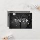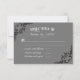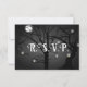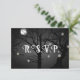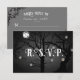 Escuro, este cartão de cercado R.S.V.P. continua o tema do casamento Gótico do Dia das Bruxas com um fundo preto macio e brilhante lua de outono atrás das velas iluminadas sem folhas. em um preto suave. O reverso é uma cinza de pedra com texto tradicional branco adornado com ornamentos mais exuberantes de ornamentado. Entra num reino onde os elementos góticos entram em contato com a estética vintage em nosso RSVP de Casamentos Góticos Negros. Uma celebração do amor e da escuridão aguarda, onde os espíritos dançam sob o luar e o feitiço do amor não conhece limites.