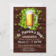 Rua, Dia de Patrick ou convites para temas irlandeses com uma caneca de cerveja e camarões no fundo da madeira.