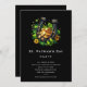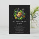 Convite de festas com uma Rua. Imagem temática do Dia de Patrick. Uma ferradura preta e dourada sentada numa cama de trevo verde com moedas de ouro brilhante.