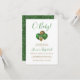 Esta Rua neutra em termos de gênero. O convite para chás de fraldas do Dia de Patrick apresenta as palavras "O'Baby" em letra verde-tenda sobre um aglomerado de balões verdes e dourados; um dos balões de ouro é tocado com brilho verde-gotejante. Personalize com o nome da futura mãe na escrita manual verde correspondente, juntamente com os detalhes do chá na fonte dourada sans serif. O verso apresenta um padrão verde incorreto de brilho.