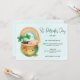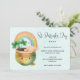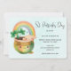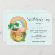 Rua. convite de festas do Dia de Patrick com uma ilustração adorável com um sorridente pote verde e ouro com um arco-íris fofo, uma nuvem feliz e um trevo verde.