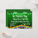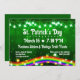 Rua divertida, convite para o dia de Patrick com luz de shamrock e um arco-íris brilhante e brilhante com moedas de ouro em fundo verde.