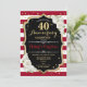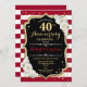 Convite de aniversário de casamento de 40 anos vermelho rubi. Cartão de convite elegante vermelho, preto e branco com dourado brilhante falso. Apresenta listras elegantes, fonte script e rosas brancas. Perfeito para uma celebração de 40º aniversário de casamento.