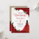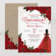 O convite da Quinceanera na rosa vermelha do telhado com sotaques de ouro e uma garota com vestido elegante. Verifique o compro deste convite com meninas com diferentes cores de cabelo e tons de pele.