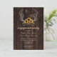 Um design de cartaz de casamento rústico e country com girassóis, galhadas e lanternas de cordas em uma madeira de celeiro velha. Use a ferramenta Personalizar para adicionar suas informações. Para mais, veja a minha coleção Rústica de Girassóis do País Antlers Wood.