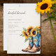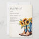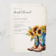Inspirado pela beleza da natureza, este convite apresenta um simples, mas encantador buquê de girassóis aninhados em botas rupestres de cowboy. A beleza natural do design de aquarela oferece um aspecto simples, mas sofisticado, que permite à beleza natural ocupar o palco central e estabelecer um humor sertanejo para um evento a lembrar.