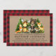 Watercolor Woodland Animal First Birthday Invitation. Os bebês incluem Urso, Veado, Moose, Raccoon, Coelho, Raposa e Coruja com um pano de fundo de pinheiros. Estilo de Papel Kraft, Pinheiro Verde Florestal, Xadrez de Buffalo Vermelho.