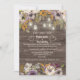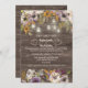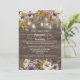 Bonito convite para janto de elopemento de casamento desenhado com um fundo de madeira rústico. Ferrugem, roxas e flores de cor d'água coloridas de marfim, folhas verdes de sábio, e lanternas e lanternas no topo da design de casamento do país.