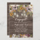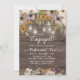 Bonito convite para festas de noivado desenhado com um fundo de madeira rústico. Ferrugem, roxas e flores de cor d'água coloridas de marfim, folhas verdes de sábio, e lanternas e lanternas no topo da design de casamento do país.