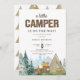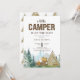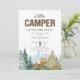 Este convite rústico divertido tem uma fonte de madeira chamada "CAMPER" e script. O fundo tem uma floresta aquosa, montanhas e paisagem. É acabada pelos elementos de acampamento bronzeado, verde e castanho, que incluem uma tenda e um fogo. O dorso tem um padrão da mesma tenda de aquarela.