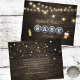 Madeira russa e escura com luzes de cordas no topo, garrafa de ouro à esquerda e caneca de cerveja à direita. Tipografia do boné de garrafa azul e branca "Baby". Todos os modelos criaram por você. O verso inclui as estrelas ouros no topo. #zazzlemade, #babyisbreu #rústico, #claraboias, #garrafas, #vida rural
