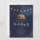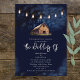 Tema de casamento russo com ilustração da fazenda rustica do campo com celeiro cercado por estrelas com luzes de cordas. Folhagem e abóboras no fundo.